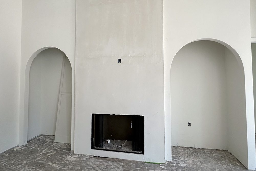 The floor-to-ceiling trim of the gas fireplace in this custom home open living area will be a highlight of the room. Views of the covered, private back patio can be seen from this open space.