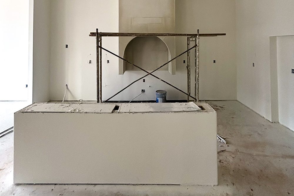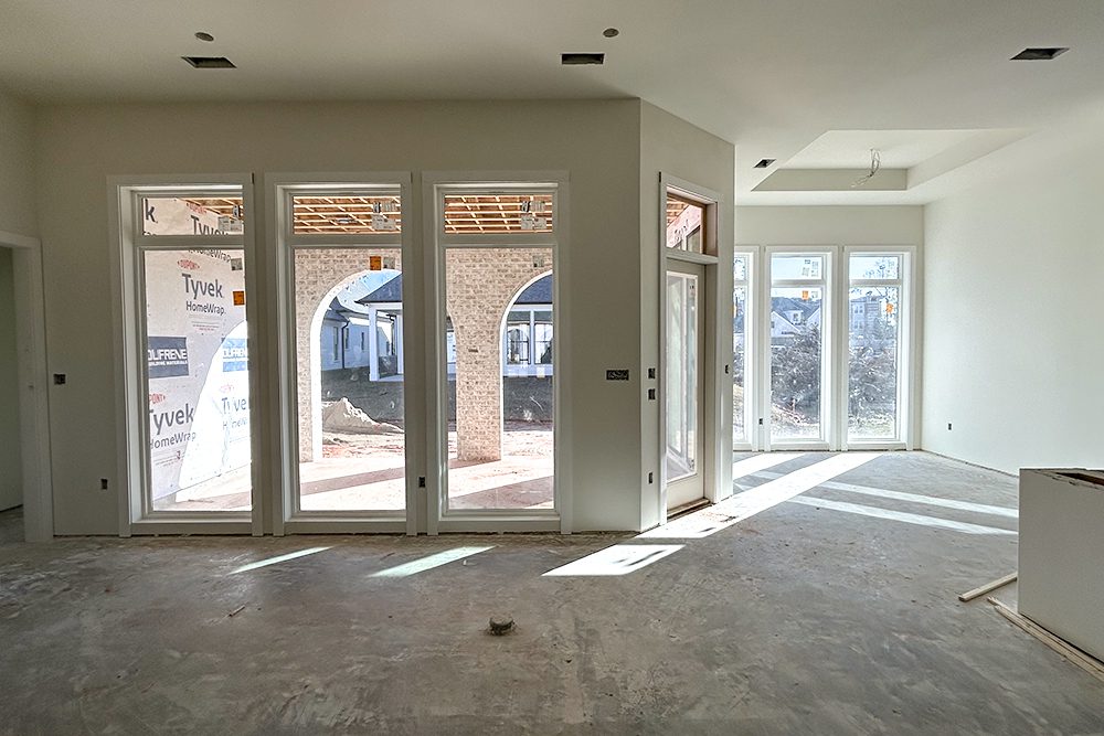 The floor-to-ceiling trim of the gas fireplace in this custom home open living area will be a highlight of the room. Views of the covered, private back patio can be seen from this open space.
