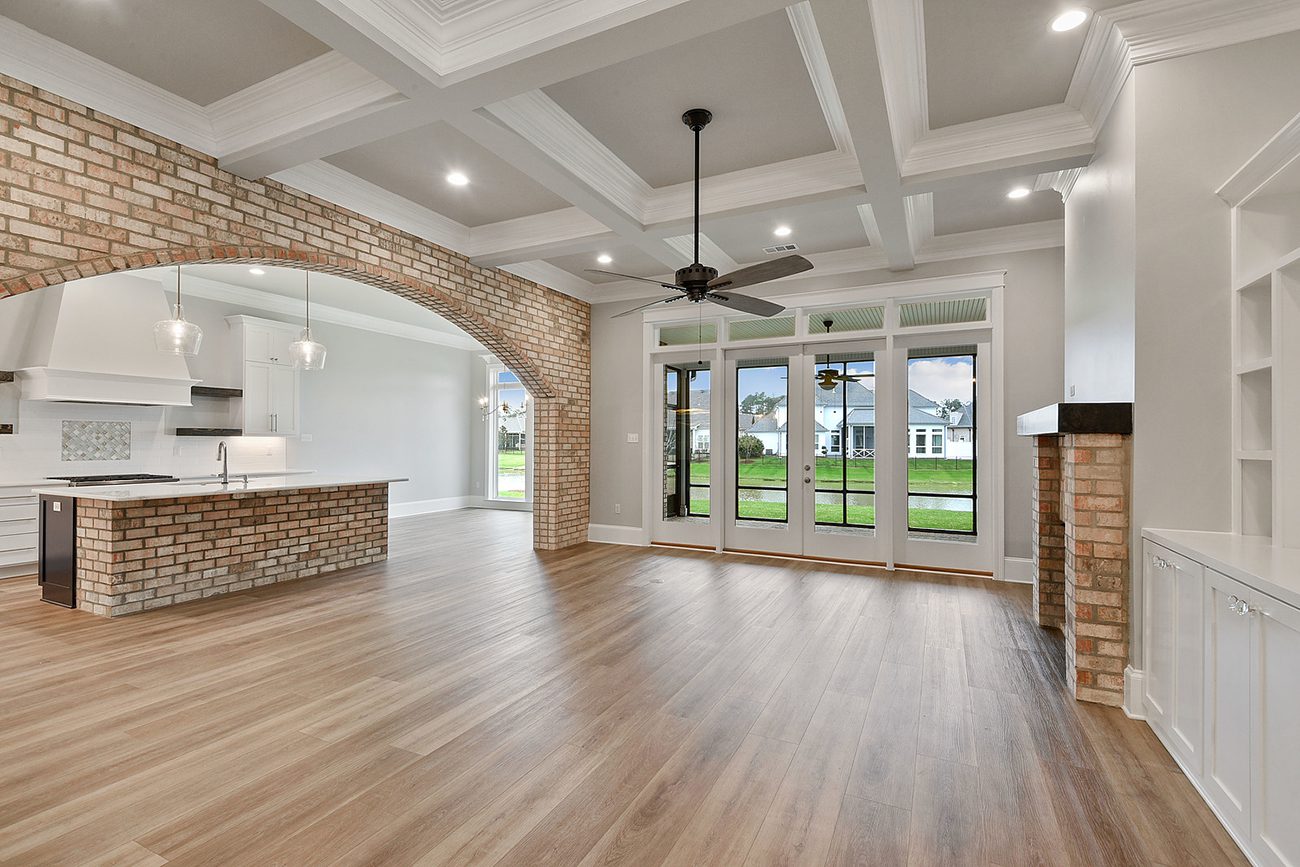 The butler’s pantry is included as part of the custom, open living area and features two-toned cabinetry, real wood shelving, a built-in wine cooler, and a unique backsplash. And, this is the just the beginning of all of the amazing interior finishes of this fully custom home in Covington. Other special extras include a full brick archway into the kitchen, coffered ceilings with inset lighting in the family room, built-ins and cabinetry around the fireplace and so much more!